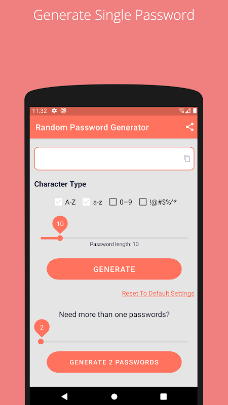 - Genera Contraseñas Individuales o Múltiples: Crea rápidamente una contraseña o genera varias contraseñas a la vez.