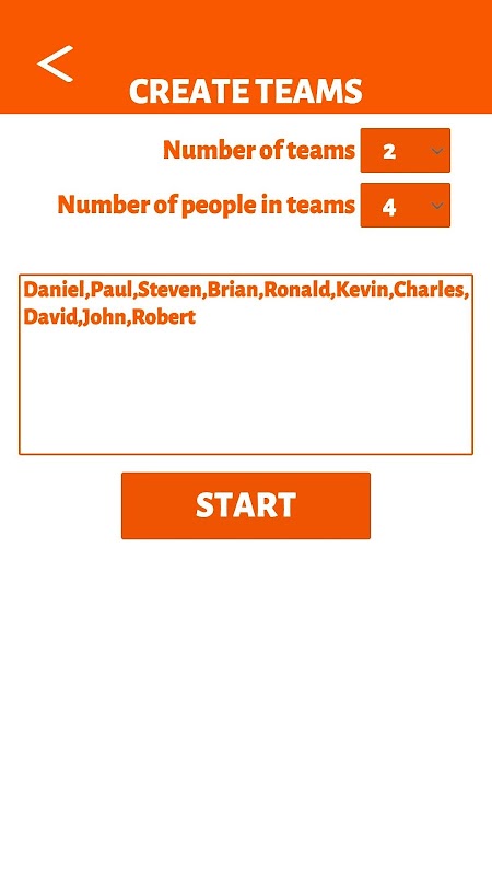 The user enters desired names with commas between them. After pressing the “Start” button, the names in the teams are selected randomly by the application. After the user press the “Copy” button, randomly generated team lists are copied to the clipboard.