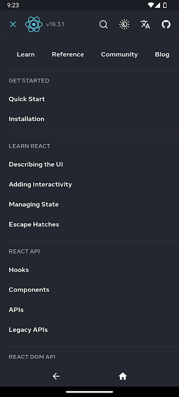 Descargo de responsabilidad: esta es una aplicación no oficial y no está afiliada ni respaldada por Facebook ni por el equipo de React.js. La aplicación está desarrollada para hacer que la documentación oficial de React.js sea más accesible en dispositivos móviles.