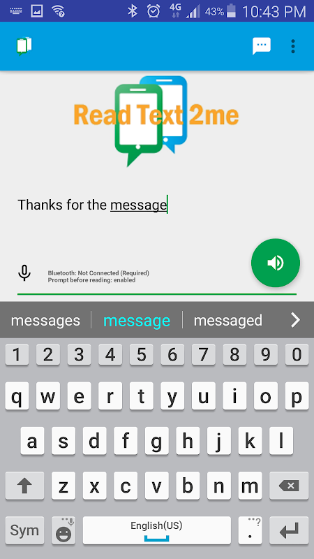 This simple and easy application allows you to read SMS/MMS messages via your in-car Bluetooth audio system or headset, with the option to select specific Bluetooth devices for use. Reading and responding to the text messages through the in-car Bluetooth audio system with minimal configuration.