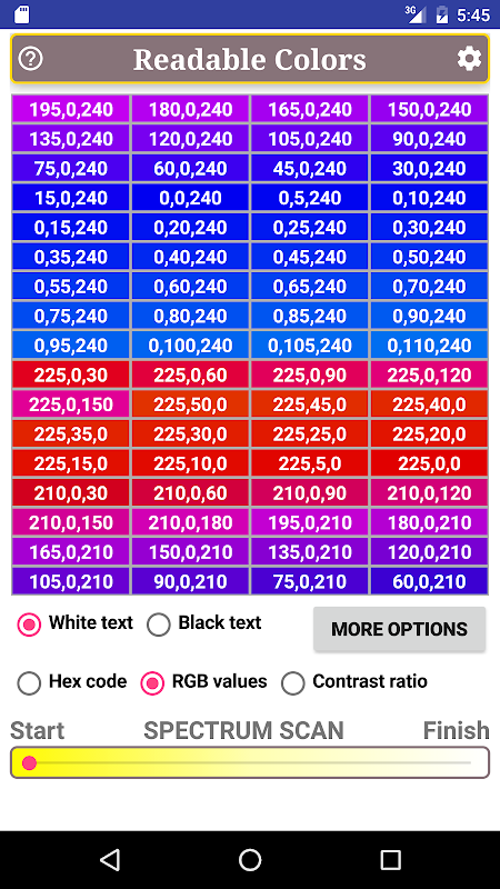 This app uses the W3C formula to help you find background colors for black and white text. You can quickly scan through virtually all available colors within the specified minimum standard. These colors you can sort by hue, by saturation, or by brightness in the HSV color system. This app also shows you either the Hex color code, or the RGB values, or the contrast ratio for all available colors.