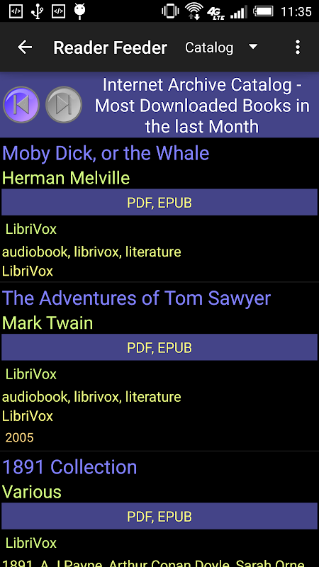 Alimentador lector tiene un apoyo especial a los libros de audio Librivox EPUB en el Archivo de Internet, y que va a extraer el audio (y otros contenidos) Información de archivo, ayudará a descargar estos archivos, y añadir automáticamente a los medios de escáner dispositivo. Mejor aún, utilizar el reproductor de audio integrado que le da acceso directo a los marcadores de capítulo para un máximo control.