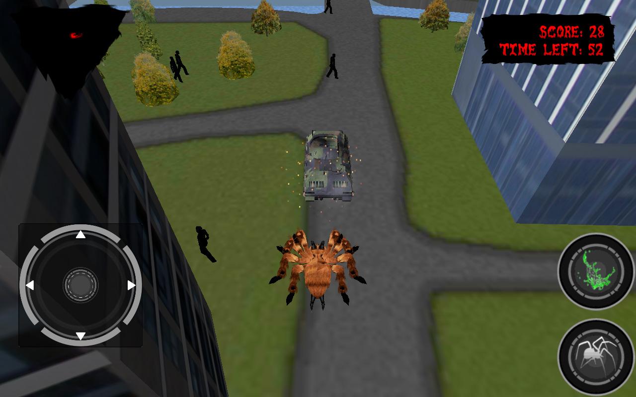 Simulador de terror Spider es un juego donde usted juega como miedo enojado mal arachno tarántula araña. Usted comienza su invasión alboroto en la ciudad sin nombre ( ciudad). No hay forma de escapar, la gente tiene que vencer al enemigo insectos espalda. El objetivo del juego es matar a tanta gente como usted puede, como una araña jefe. La gente va a salir corriendo gritando , por lo que deben cazarlos y matarlos. Usted debe empezar a matar a la gente tan pronto como sea posible para mantenerse con vida . En el juego se puede ver también los tanques , que te va a matar , si no destruirlos. La única manera de destruir tanques es salpicar ácido sobre ellos. Destruir tanque con darle tiempo y la vida extra. Juego también contiene tablas de clasificación para más challange . Este juego está lleno de sangre , horror y sangre. Disfruta de los hermosos gráficos en 3D. Este juego es bueno para los propósitos de relajación y liberar el estrés. Así que no espere y empalar algún cadáver humano en gran pata de araña .