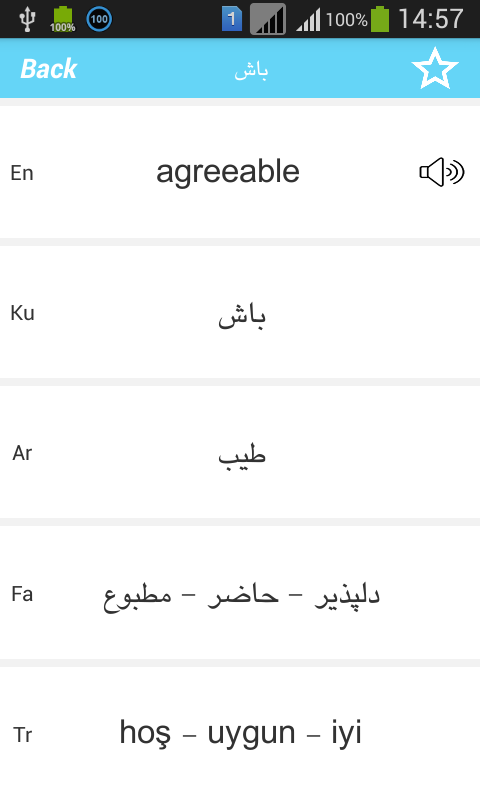 Rebin dictionary is the first kurdish dictionary which includes more than 40,000 words with (( English-Kurdish-Arabic-Persian-Turkish )) meanings.WORKS OFFLINE - no Internet connection needed when searching words.