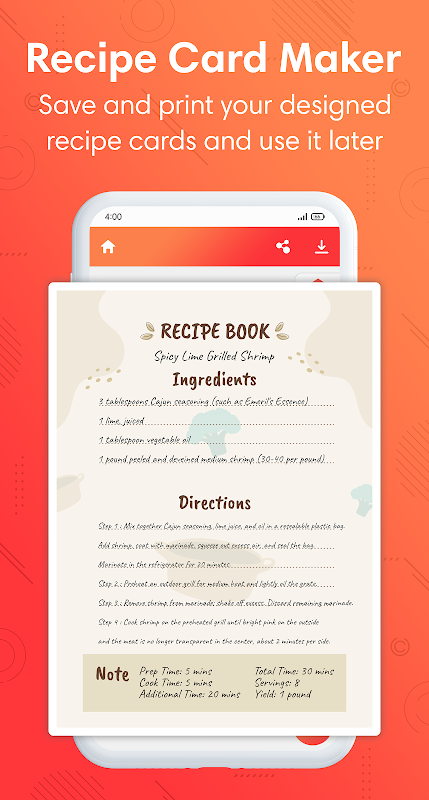 Puede hacer cualquier tipo de tarjetas de recetas y también guardarlo en la galería móvil para que se imprima.