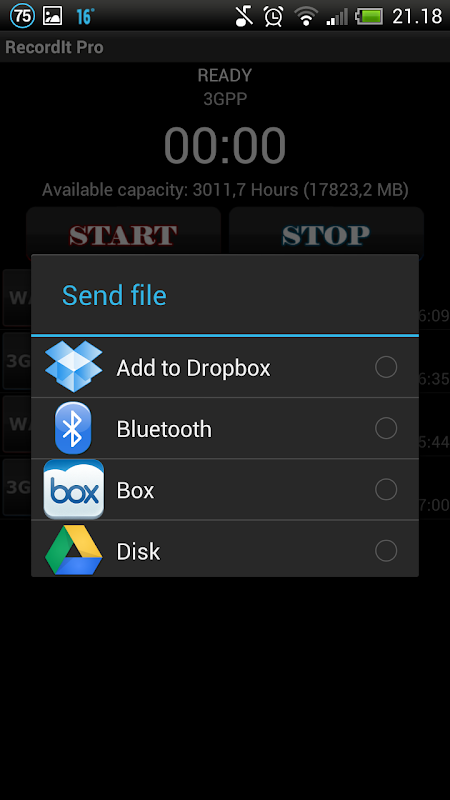 RecordIt es un grabador de sonido / voz / micrófono que le permite grabar tanto en formato 3GPP y wav, para que pueda elegir la calidad de su preferencia. También puede enviar sus grabaciones a través de correo electrónico, Dropbox +++ si usted necesita (basta con hacer clic y mantenga presionado el archivo que desea enviar).