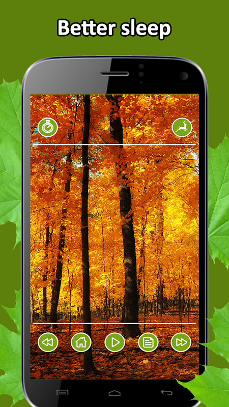 Relax aplicación Bosque le ayuda a relajarse y conciliar el sueño. Los sonidos se pueden reproducir de forma continua, o activar el temporizador, lo que apagará el sonido después de un tiempo especificado. Disfrutar de los sonidos y dormir como un bebé.
