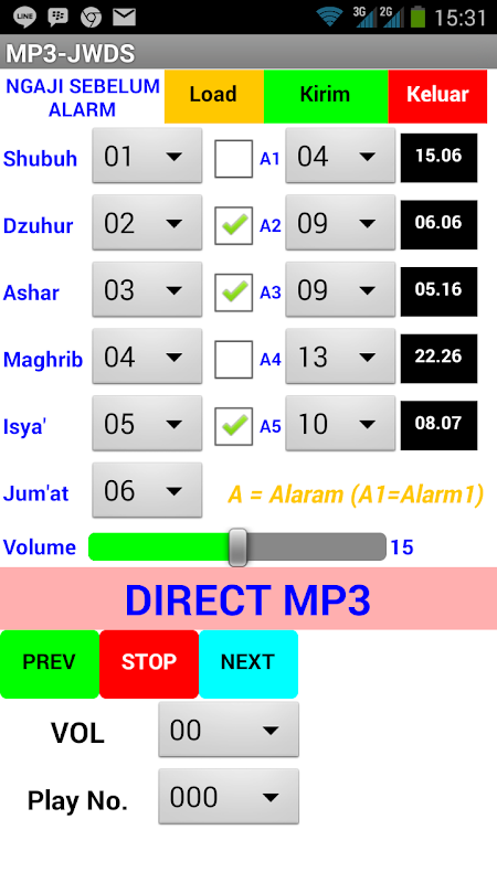 waktu sholat (ngaji), timer ngajinya, direct mp3 yaitu bisa play,next,prev,stop dan volume