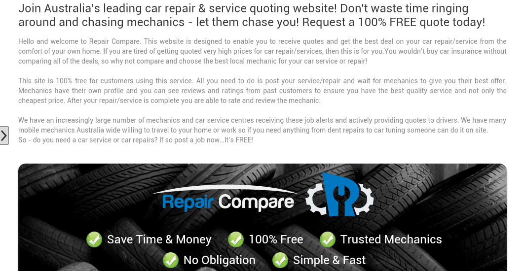 Repair Compare connects car owners with local trusted mechanics in Australia to receive FREE online car quotes for servicing or repairs. Finding a professional and trustworthy local mechanic used to be a difficult task, until now! Repair Compare is a great new platform connecting customers with local trusted mechanics throughout Australia. It is completely FREE, and only takes a few moments to get started. Save time and money with affordable car mechanic repairs and servicing. Stop chasing mechanics – let them chase you, with great value mechanic services.