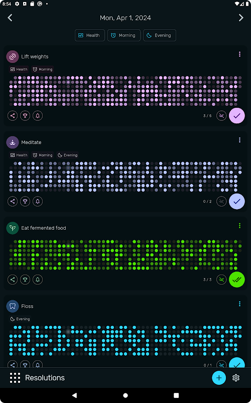 Resolutions es una forma sencilla de llevar un registro de tus cambios de vida. Ideal para quienes buscan cambiar su estilo de vida o establecer nuevos hábitos. Desde empezar a meditar y hacer ejercicio hasta dejar la comida chatarra, Resolutions te ayuda a mantener el control. Visualiza tu progreso rápidamente con mapas de calor a color.