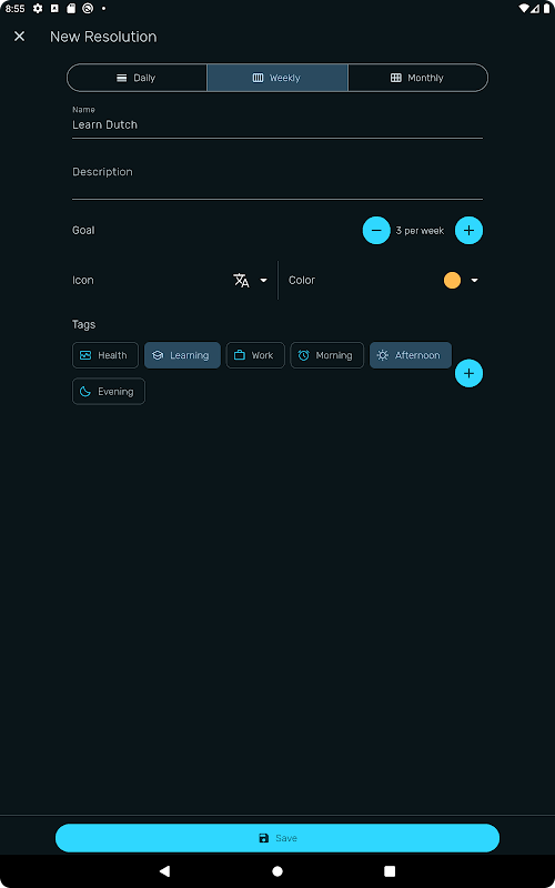 Añade nuevos propósitos en segundos. Introduce un título, una breve descripción y elige un icono y un color para empezar.
