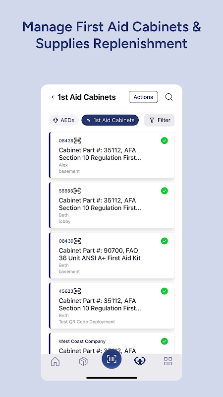 Asegúrese de que sus desfibriladores externos automáticos (DEA), gabinetes de primeros auxilios y kits de control de sangrado estén listos para responder cuando ocurra una emergencia. Utilice su teléfono inteligente para registrar inspecciones de preparación sobre la marcha y revisar cuestiones como los próximos vencimientos de suministros y necesidades de mantenimiento. Las credenciales de inicio de sesión están vinculadas a su nivel de acceso, lo que le brinda solo la información de la que es responsable.