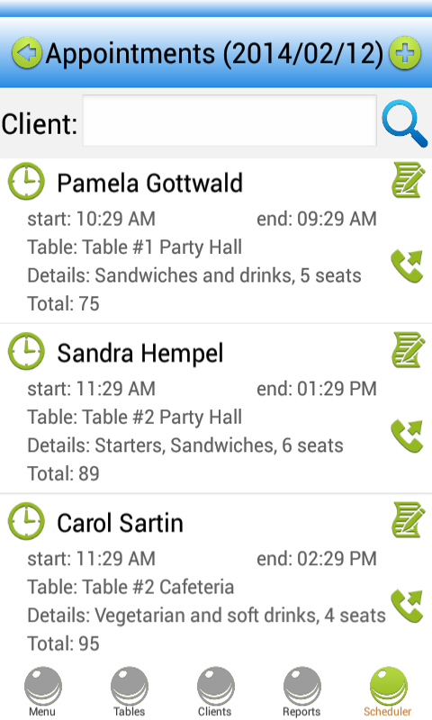 ★ La sección de tablas permite anotar las reservas de tablas junto con el número de identificación y cualquier nota particular que pueda ser requerida. Puede crear y consultar citas fácilmente a través de esta sección e incluso hacer una llamada telefónica directa desde el programa a sus clientes para confirmarlas.