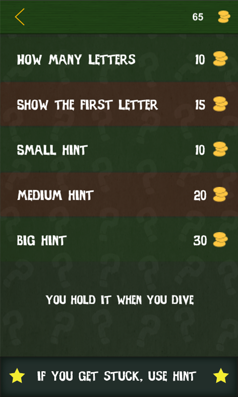 Riddle me this is an interesting guess the word game for both children and adults. Make your brain work faster and better, and solve those tricky riddles. This is not another 'arrange the letters game'. Here you will need to type the correct answer in order to progress to the next riddle. If you are stuck, you can use hints to help you solve the riddle. There are five type of hints: how many letters, the first letter, small hint, medium hint and big hint. If you still can't solve it, use solution option.