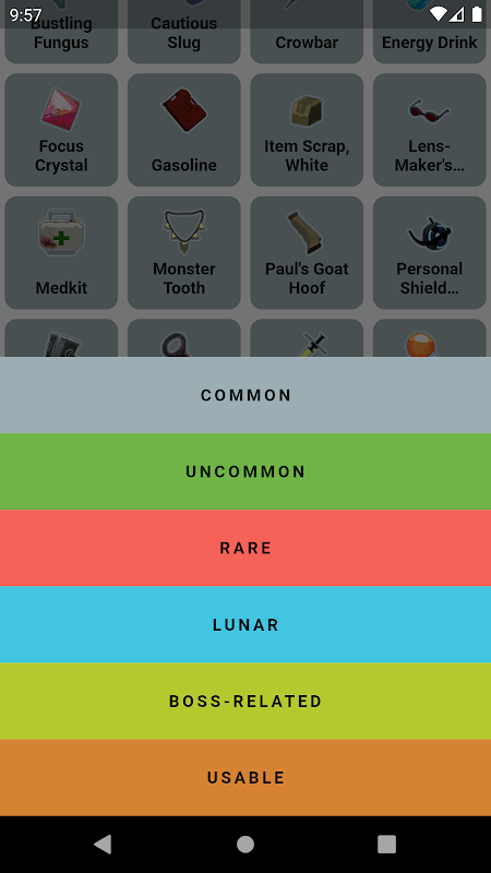 Esta aplicación es una herramienta de referencia para Risk of Rain 2. Busque u ordene por categoría para encontrar información detallada sobre los elementos que encuentre en el juego.