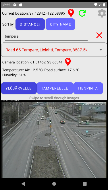 Esta aplicación puede mostrar las cámaras meteorológicas de carretera finlandesas más cercanas y, alternativamente, permite buscar cámaras, por ejemplo, por el nombre de la ciudad.