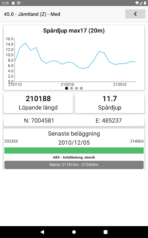 Ahora puede ver fácilmente los últimos datos de pavimento y medición para la carretera en la que se encuentra. Road Analyzer muestra datos de la API abierta de la Administración de Transporte de Suecia en función de la posición del GPS. La aplicación recupera datos continuamente a medida que avanza por el camino. El Road Analyzer muestra información sobre el trabajo de pavimentación más reciente, la longitud de carrera, la profundidad de la pista, el IRI, la profundidad del borde y la pendiente del fondo de la pista.