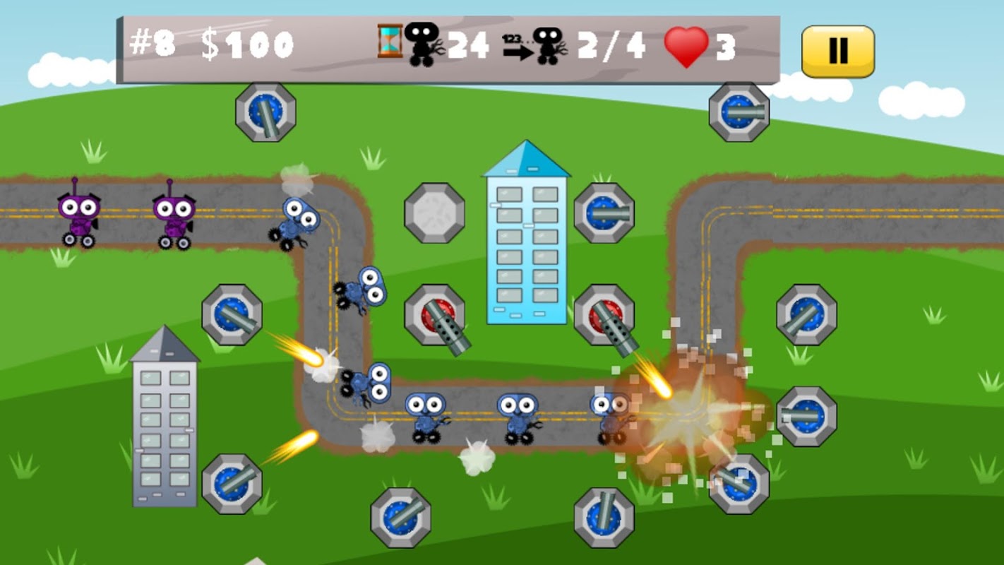 Los robots enemigos están atacando tu ciudad. Usted debe comprar cohetes de tiro y poner cohetes de tiro en el lugar correcto para detener a los robots enemigos. Cada robot que matas, obtienes dinero. Utiliza dinero para comprar más cohetes de tiro.