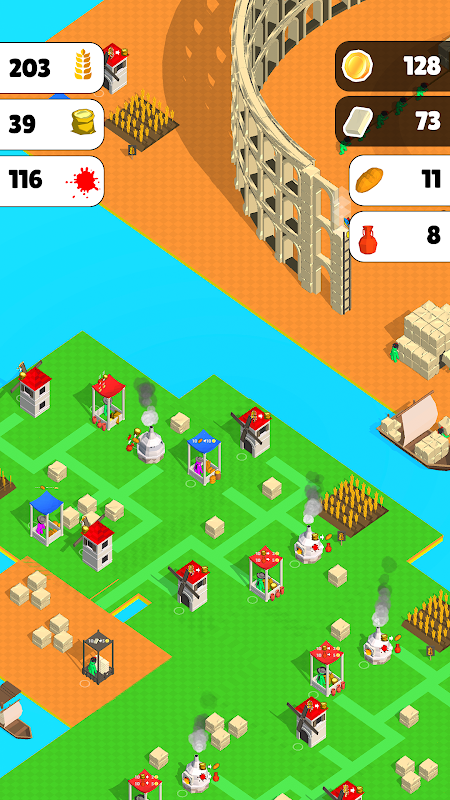Roman Builder es un juego de simulación único. Haz crecer tu ciudad explorando. Activa numerosos edificios, tiendas, puentes, muelles e intercambia recursos con oro.