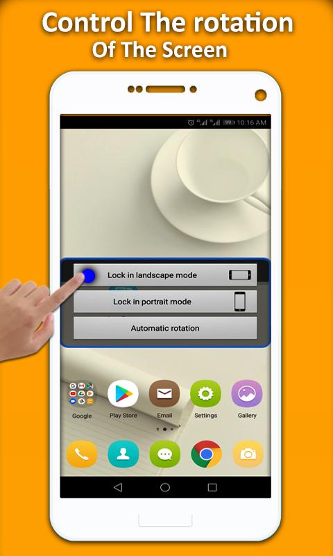 La aplicación de control de rotación controla la rotación de la pantalla en las cuatro direcciones, horizontal, vertical o invertida para cambiar la orientación del teléfono. El control de cuatro vías también permite la rotación realista de retrato a paisaje. Incline el teléfono para disfrutar del modo vertical u horizontal, la rotación automática de la pantalla del teléfono lo ayuda a usar su teléfono en cualquier dirección. Haga que el dispositivo gire con controles suaves en cuatro direcciones. La rotación es fácil e instantánea con el control de rotación de la pantalla en horizontal o vertical. Determine libremente la orientación de la pantalla y especifique el giro de giro de dirección automática.