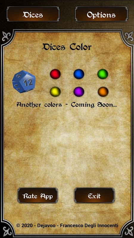 Role-playing dice generator with fantasy-themed interface and graphics.