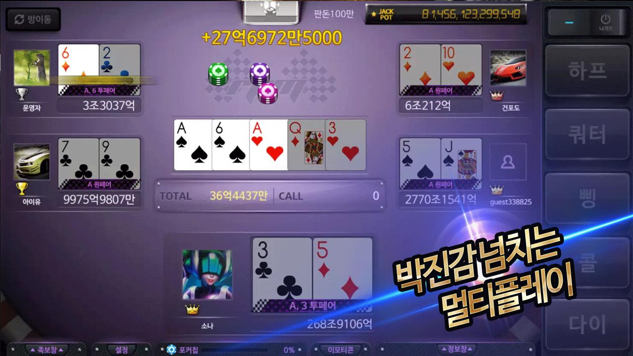 - 싱글 플레이와는 다른 실제 대전 상대와 화끈한 한판의 베팅을 느껴보세요.