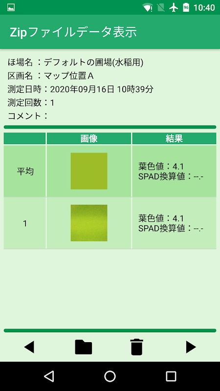 本アプリはライススキャンアプリで測定・保存したデータを同じ携帯端末で表示するアプリです。作物の葉色測定結果をその場で簡単にチェックすることができます。