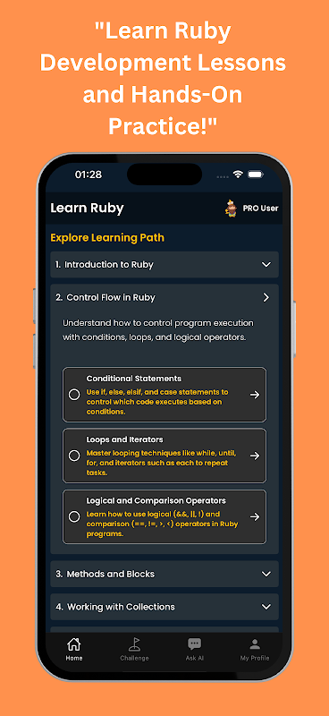 Aprendizaje impulsado por IA: aprenda Ruby con la ayuda de un tutor inteligente de IA que explica cada concepto paso a paso. La IA divide temas como clases, bloques, mixins, manejo de archivos y diseño orientado a objetos en explicaciones simples. Comprenderá completamente cada concepto antes de seguir adelante, lo que le permitirá aprender a su propio ritmo sin confusión ni frustración. Ya sea que esté trabajando en bucles o explorando módulos, la IA lo guía con consejos personalizados y comentarios instantáneos.
