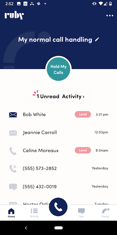 Todo lo que necesita para administrar su negocio desde cualquier lugar es Ruby y su teléfono celular. Use la aplicación Ruby para Android para ver mensajes, actualizar su estado, hacer llamadas y enviar mensajes de texto desde su número comercial. Desvíe fácilmente sus llamadas desde y hacia Ruby o verifique su uso mientras viaja.
