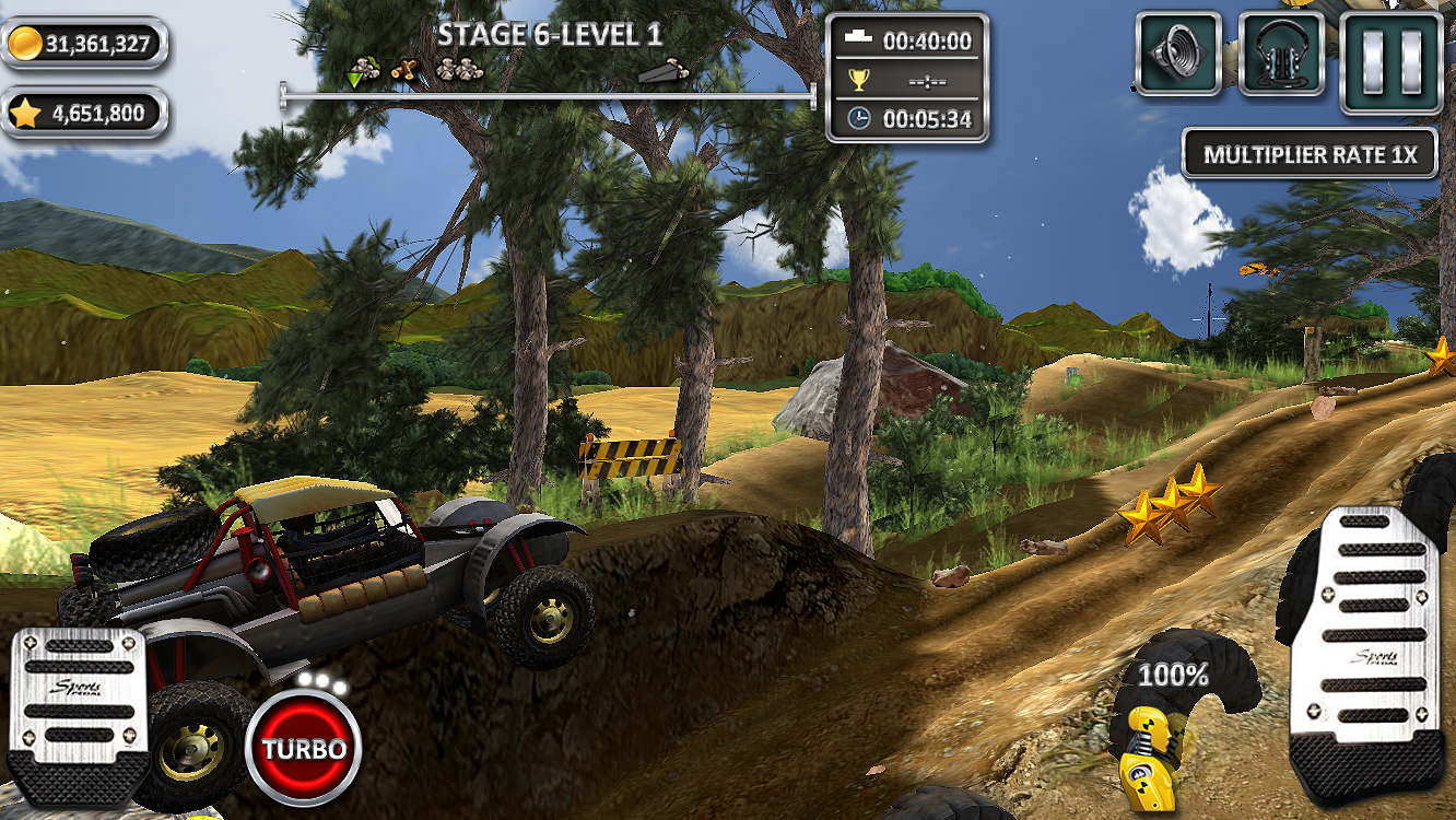 At the beginning you are able to race with the first racing car. You have to collect skillpoints on Special Stages to be able to unlock the other 3 racing cars. Race on the stages and collect as many coins and stars as you can. Don't forget to upgrade your racing cars as soon as you have enough coins and stars or you have trouble to accomplish a level within the time limit. Yes, every levels of every stage have a time limitation to accomplish. Unlock new stages for coins to be able to collect more coins and stars. So choose a car and a level and let's start racing! Tap on Start button to move your racing car to the starting position. Then the race is going to start as soon as you tap on the gas pedal.