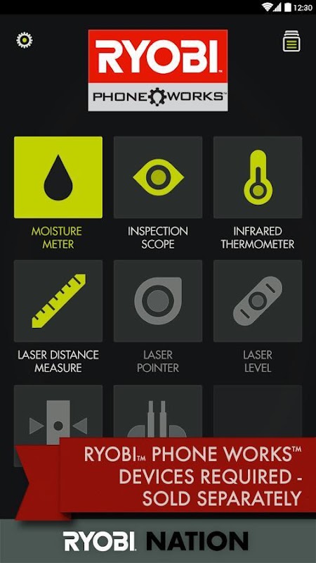 RYOBI telefónicas de Obras aplicación funciona con dispositivos RYOBI teléfono funciona para lograr una mejor manera de administrar los proyectos de mejoras del hogar. Obras de teléfono ™ herramientas le ayuden a medir, alinear, calcular, inspeccionar, nivel y localizar con más confianza y funcionalidad que nunca. Descarga la aplicación gratis hoy para trabajar con su teléfono funciona dispositivos, y transformar el teléfono en su herramienta más inteligente.