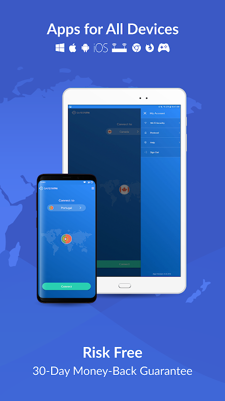 Una vez conectado, SaferVPN lo protege de intrusos, ISP y terceros. Esto hace que cualquier punto de acceso Wi-Fi sea seguro de usar y le permite ocultar su verdadera ubicación.