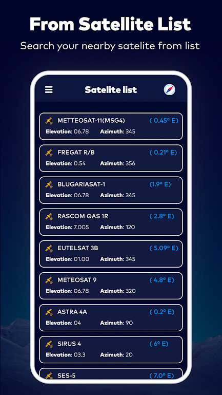Satellite Finder & Dish pointer tiene más de 200 satélites en vivo disponibles en todo el mundo.