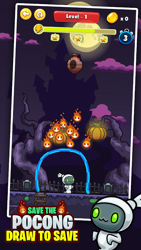 Pocong Mumu está perturbado por monstruos, salvemos a Pocong dibujando una barrera de cuerda donde al dibujar esta cuerda puedes salvar a Pocong de ser perseguido por fantasmas traviesos.