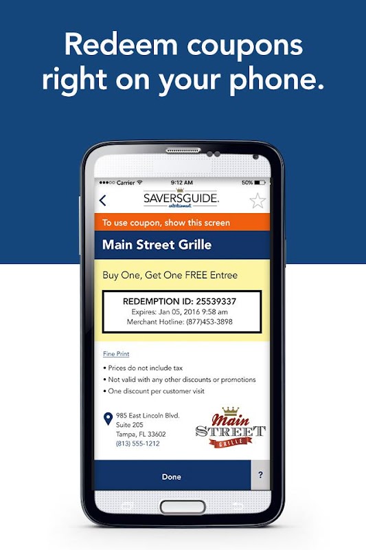 Ahorra hasta un 50% en las cosas que haces todos los días con cupones canjeables móviles! Con la membresía SaversGuide, puede ahorrar $ 100s en sus restaurantes favoritos, sobre las actividades y atracciones, viajes y hoteles, y mucho más.