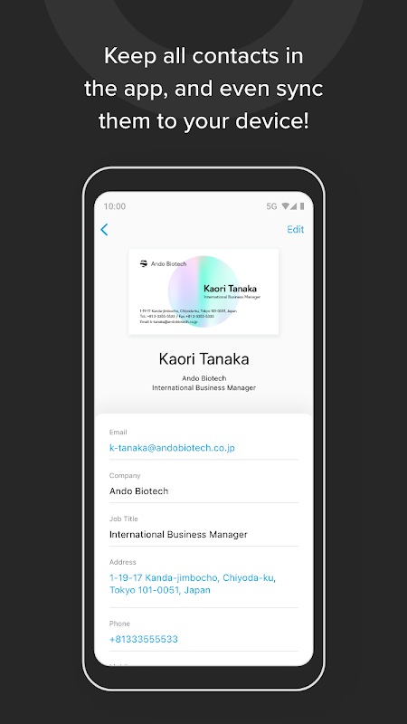- A diferencia de cuando ingresa manualmente o por otros medios, con nuestro proceso de transcripción obtendrá resultados consistentes y precisos. Las tarjetas de visita que escanea también se pueden ver en la aplicación, e incluso puede exportarlas a la lista de contactos de su teléfono.