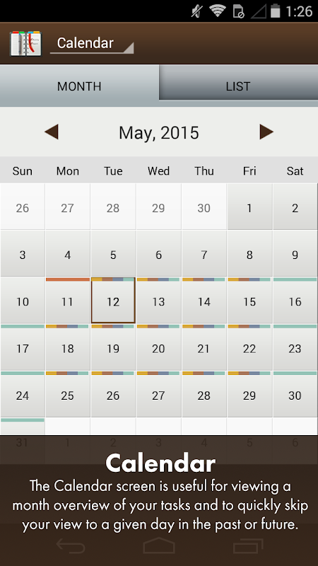 Tareas y días completos se pueden planificar con antelación y vieron el día a día a través de un calendario o lista de gráficos visión práctica. Ver categoría colores marcan cada día en su calendario con las tareas planificadas.