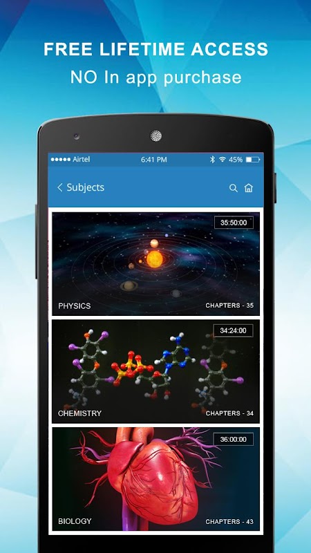This app contains over 1500+ Science FREE Animated digital videos covering of almost 100+ hours of PHYSICS, CHEMISTRY and BIOLOGY lectures. All the videos are developed in full HD resolution so experience the better performance with High Speed internet.