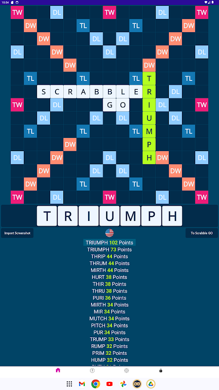 ¿Necesitas ayuda para encontrar las mejores palabras, derrotar a tus oponentes o mejorar tu vocabulario? Scrabble GO Cheat es tu asistente definitivo, lo que hace que ganar siempre sea fácil. Con tecnología OCR avanzada, la aplicación escanea rápidamente su tablero de juego Scrabble GO y analiza el juego utilizando diccionarios actualizados y un potente algoritmo de solución. El resultado son las mejores palabras posibles, clasificadas según la puntuación más alta, con instrucciones claras sobre dónde colocarlas en el tablero. La aplicación no tiene publicidad, lo que te permite concentrarte completamente en mejorar tu juego. Haz que Scrabble GO sea más divertido y desafiante con Scrabble GO Cheat: ¡tu atajo hacia el éxito!