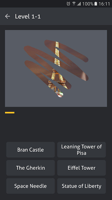 The game has a bunch of levels grouped in different worlds. Each level has a hidden picture of a landmark. Scratch the screen until you figure out what landmark is displayed on the picture. Once you recognize the hidden landmark select the correct answer from the options provided. Each correct answer earns you points, but have in mind that you shouldn't scratch the whole area. The less you scratch, the more points you will get. The yellow bar bellow the image shows how much more remains for you to scratch.