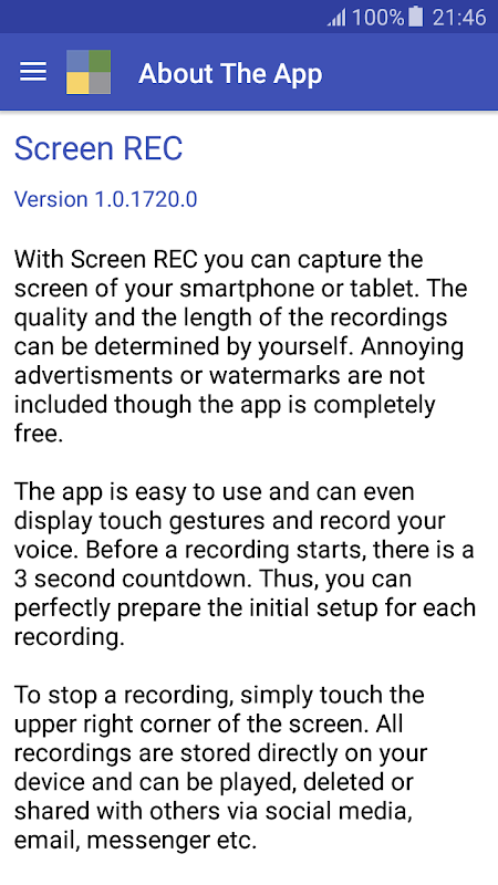 Con REC de la pantalla que puede capturar la pantalla de su teléfono inteligente o tableta. La calidad y la duración de las grabaciones se pueden determinar por sí mismo. Advertisments molestos o marcas de agua no están incluidos, aunque la aplicación es completamente libre.