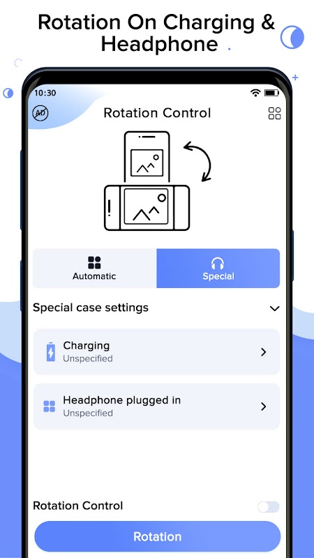 ¿Quieres usar tu teléfono inteligente en modo horizontal? ¿Prefieres jugar a juegos en modo retrato? Luego, la aplicación Control de rotación de pantalla - Administrador de orientación le permite convertir automáticamente las aplicaciones de especificaciones al modo horizontal. Hay diferentes tipos de rotación disponibles en la aplicación. La configuración de carga y el complemento de auriculares están disponibles en configuraciones de casos especiales. También puede configurar el icono para si desea mostrarlo o no. Los cambios de rotación del área de notificación se guardan automáticamente para cada aplicación desde el modo de guardado automático. Usando patrones, puede elegir cuántos iconos permitirá la rotación. Puede seleccionar un máximo de 7 aplicaciones para la rotación automática desde la opción de patrón. Todas las configuraciones se aplican desde la barra de notificaciones de su teléfono. Estas características hacen que esta aplicación sea útil para todos. Por lo tanto, descargue esta aplicación especial de rotación de pantalla ahora para usar fácilmente su teléfono.