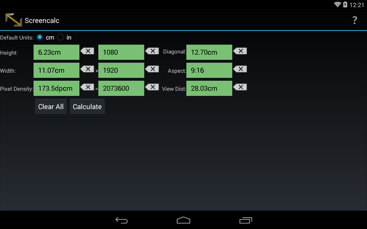 Calcula parámetros de la pantalla de visualización: anchura, altura, diagonal, la densidad de píxeles, etc