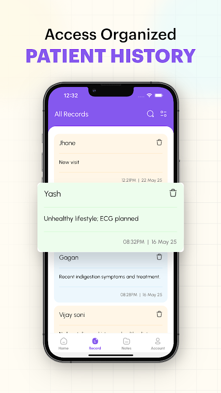 Grabe las interacciones médico-paciente de forma natural, sin guiones ni configuraciones. Solo toque y listo.