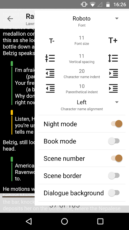 - Lea los scripts desplazándose verticalmente como en un sitio web (predeterminado) o volteando páginas tocando la pantalla hacia la izquierda y hacia la derecha como en un libro electrónico ('Modo libro')