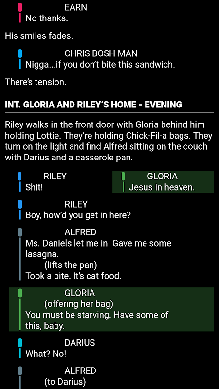 - Navegación de escena: deslice el dedo desde el borde izquierdo de la pantalla para ver una lista de todas las escenas en el guión. Toque uno para navegar directamente a esa escena.