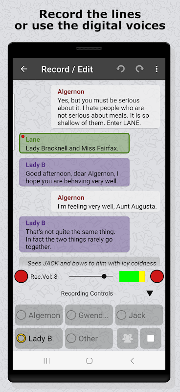Puede comenzar a grabar su propia voz de inmediato. O puede importar su guión de teatro o película* o simplemente escribir sus líneas. Script Rehearser se los volverá a leer cuando lo desee utilizando sus opciones personalizables para solicitarlo. Optimice la forma en que ensaya a medida que avanza.