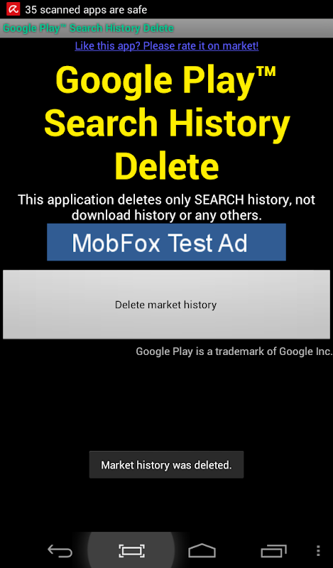 Erase your Google Play™ search history in one click! Works with new Market and with old Market application as well. Just press the button and your market search history will be clear. Clean it now!