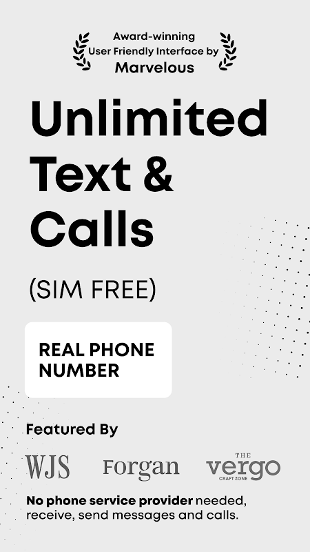 Elige un número de teléfono local o internacional y empieza a enviar mensajes y llamar al instante. Elige un código de área, crea una segunda línea privada para uso personal o empresarial y disfruta de una bandeja de entrada limpia que mantiene tu número principal seguro. Tu nuevo número de teléfono funciona con wifi o datos móviles, para que puedas estar conectado en cualquier momento y lugar.