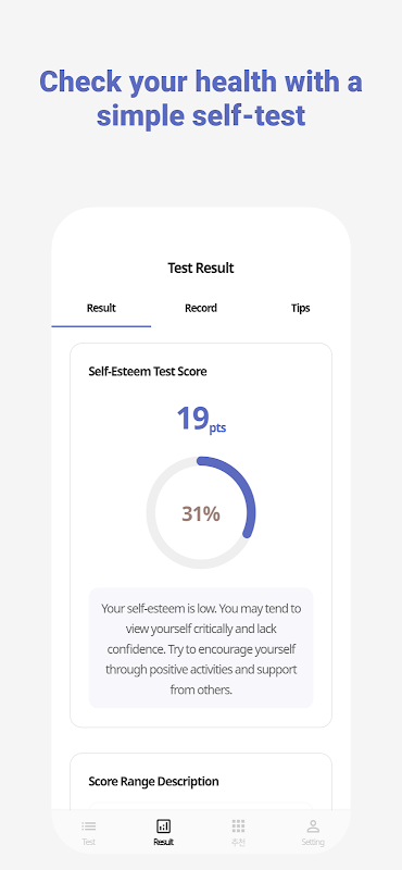A través de este sencillo test psicológico, comprueba tu nivel de autoestima y obtén ayuda para tu crecimiento personal y mejora de tus relaciones. Los consejos y sugerencias prácticos de la aplicación le ayudarán a desarrollar un sentido más saludable de autoestima.